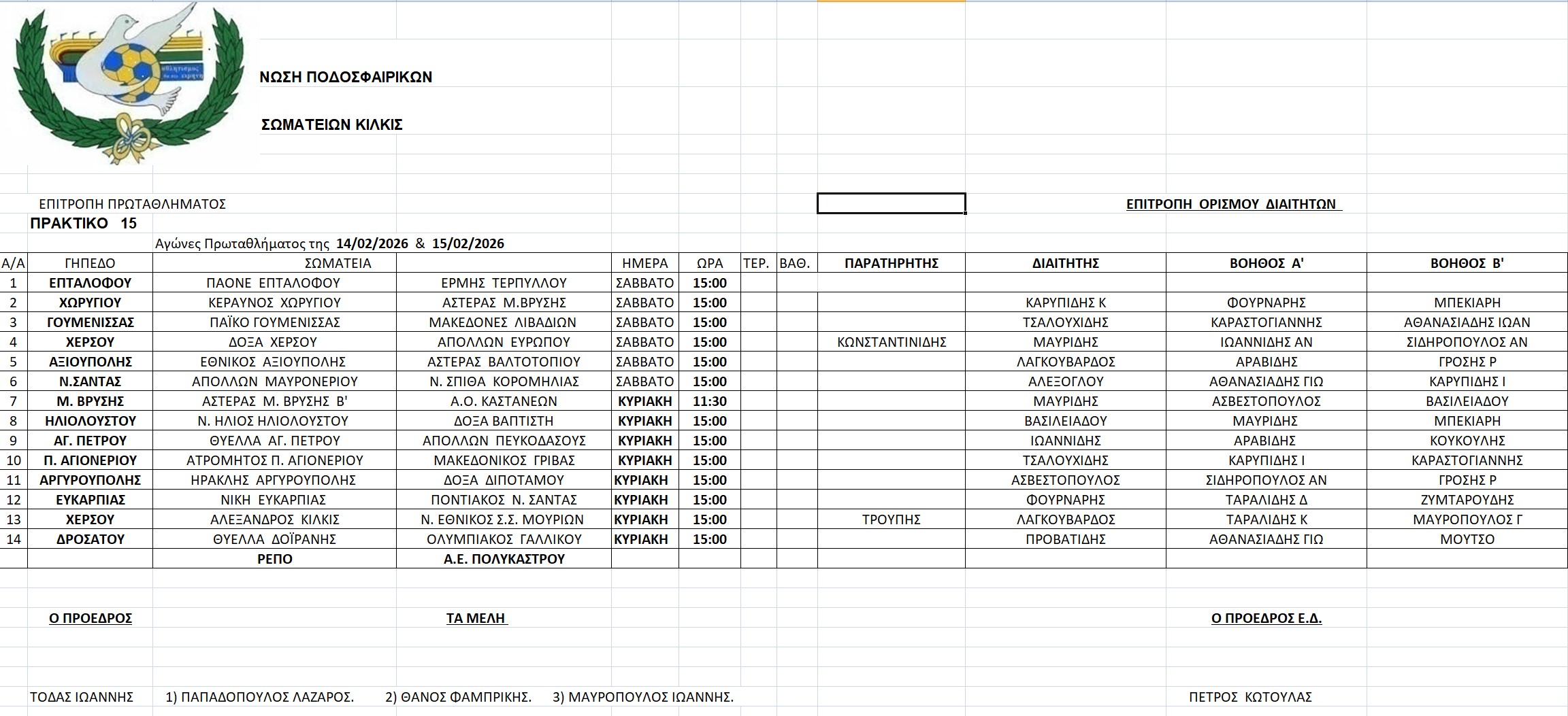 Οι διαιτητές των αγώνων 14-15/2/2026