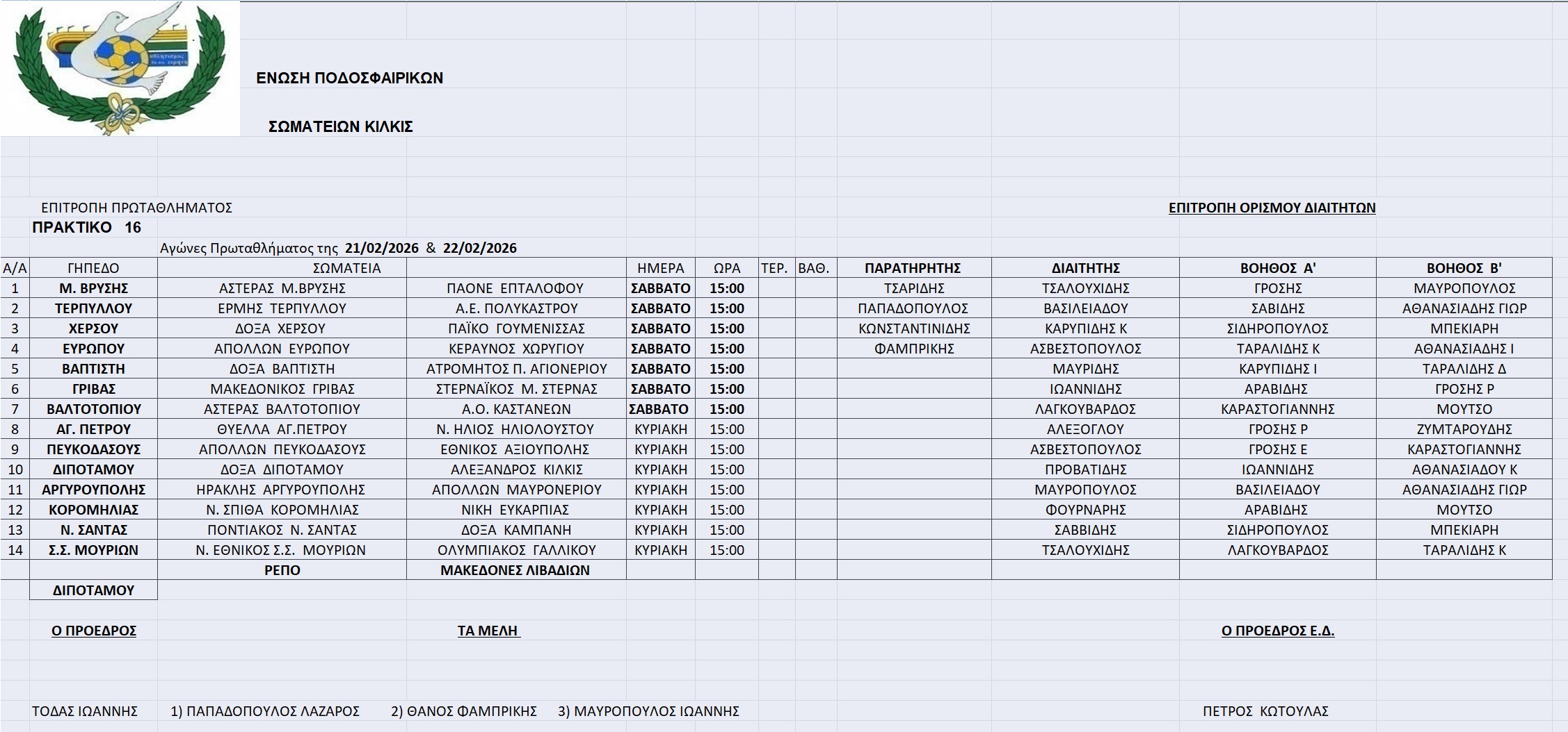 Οι διαιτητές των αγώνων 21-22/2/2026